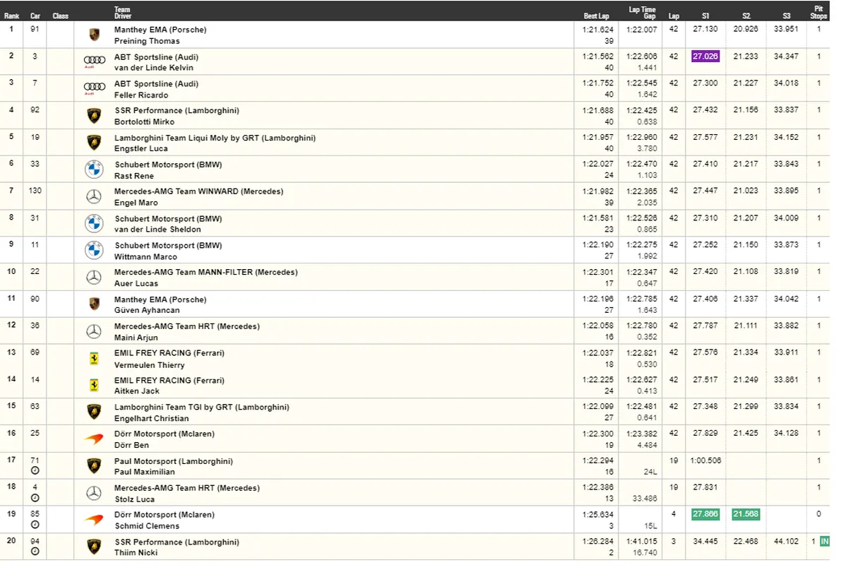 Il sorpasso di Preining non è passato inosservato alla direzione gara che ha messo sotto investigazione il comportamento del pilota Porsche. La direzione gara ha deciso di far scambiare posizione al duo ABT.