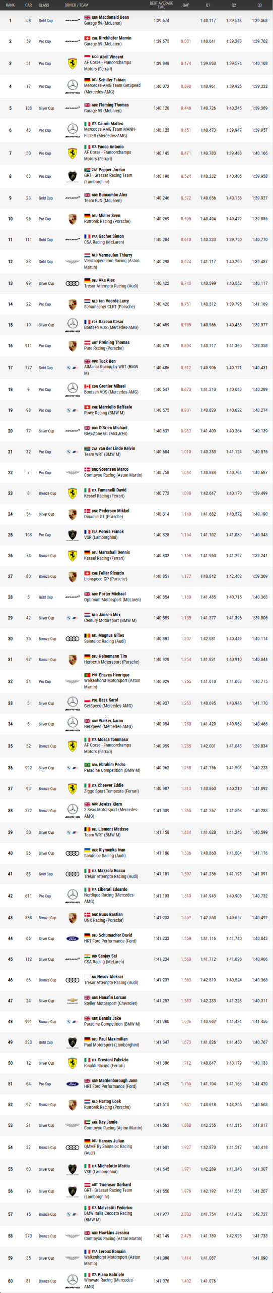 La #58 Garage 59 di MacDonald però sorprende tutti nel Q3, segnando un 1:39,363 che porta l’auto di classe Gold Cup in pole, per appena 1 millesimo sulla #59, con la media di 1:39,674, mentre la Ferrari #51 di Rovera/Abril/ye chiude in calo e si deve accontentare della terza posizione.