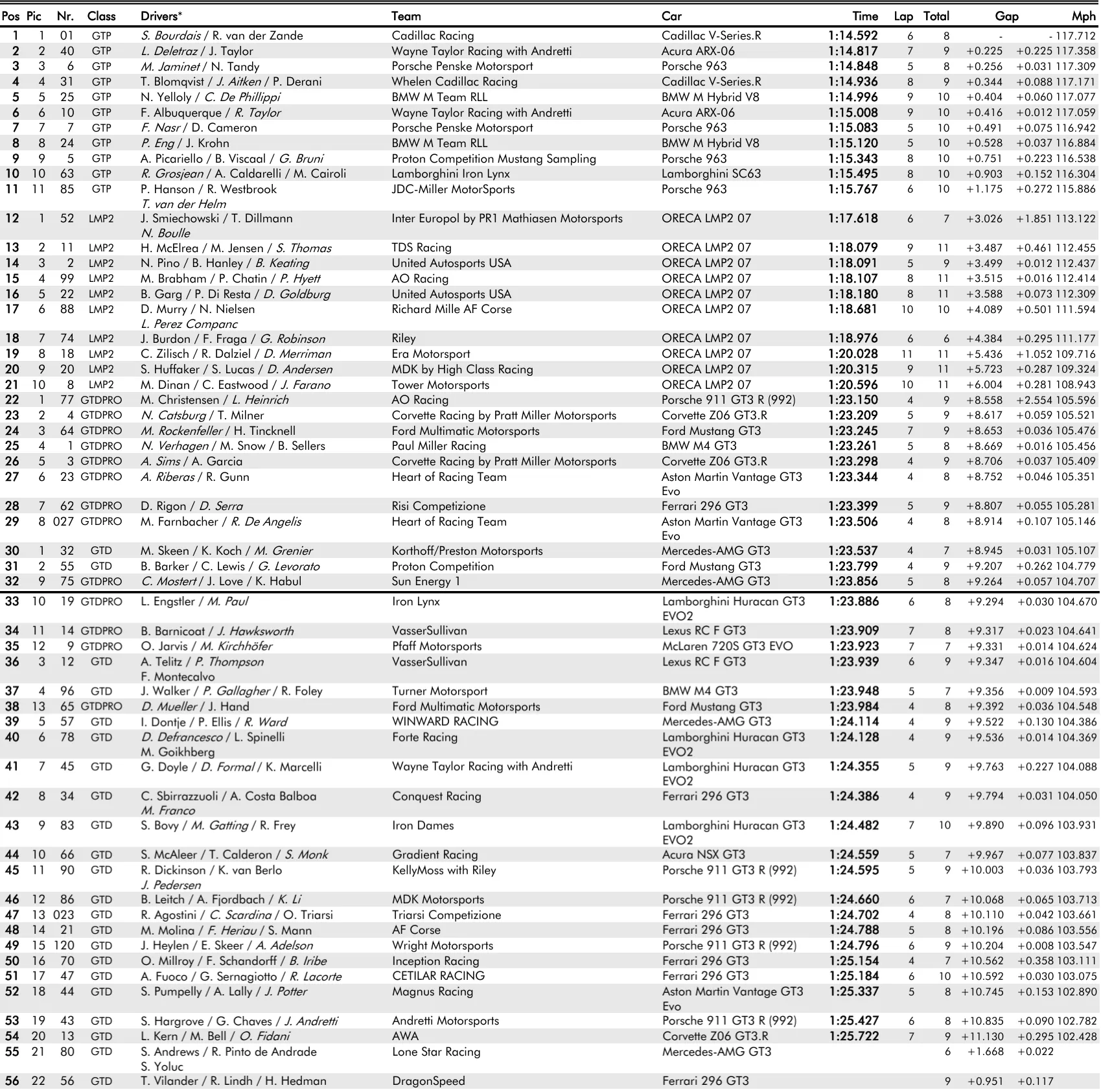 Al quarto posto troviamo la Cadillac #31 Action Express di Aitken, a 3 decimi, poi la BMW #25 di De Philippi, mentre Ricky Taylor sulla Acura #10 e Felipe Nasr sulla Porsche #7 non sono scesi sotto 1:15, con la BMW #24, la Porsche #5 Proton, la Lamborghini #53 e la Porsche #85 JDC-Miller che completano la griglia GTP.