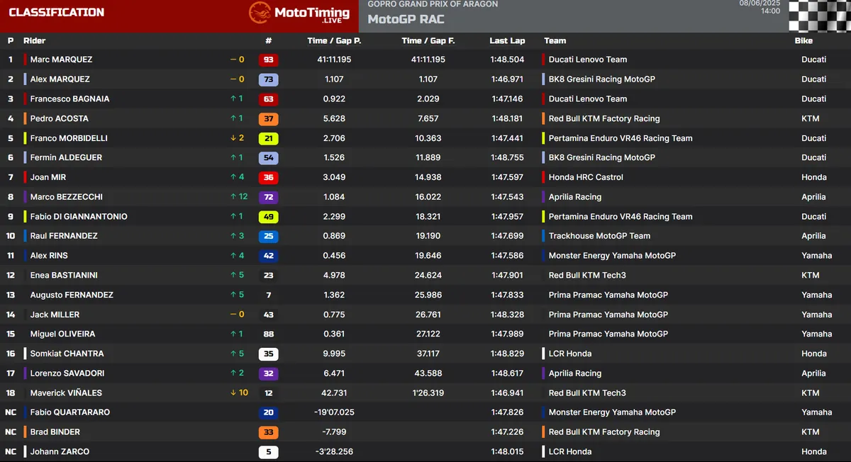 Il sabato dell’edizione 2025 ha così pienamente rispettato il pronostico. Marc ha infatti ottenuto nuovamente la pole position e vinto la Sprint, rimontando e superando il fratello a circa metà gara. Dal canto suo, Alex conquista l’ennesima seconda piazza del 2025 e in classifica scivola così a 27 lunghezze dal fratello-rivale.