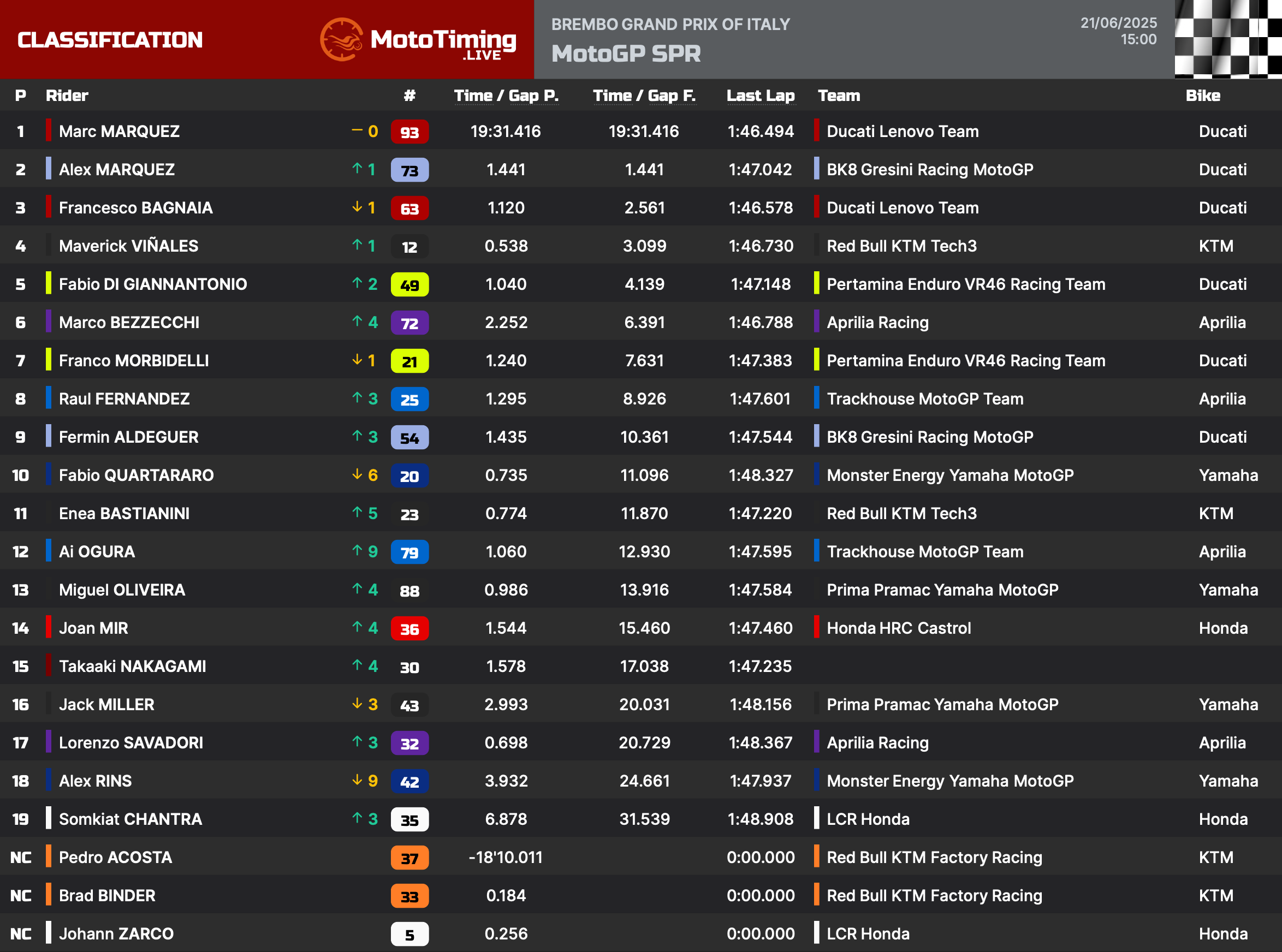 Marc Marquez ha conquistato la vittoria nella Sprint Race della MotoGP in Italia, precedendo Alex Marquez e Francesco Bagnaia. Il n.93 è partito in leggero ritardo a causa di un piccolo problema sulla moto, perdendo alcune posizioni in partenza. Ottima gara da parte di Maverick Vinales che ha concluso al quarto posto, davanti a Di Giannantonio e Bezzecchi. Settima posizione per l’altra Ducati del team VR46 di Morbidelli, seguito da Fernandez e Aldeguer. Mentre, conclude la top 10 Fabio Quartararo.