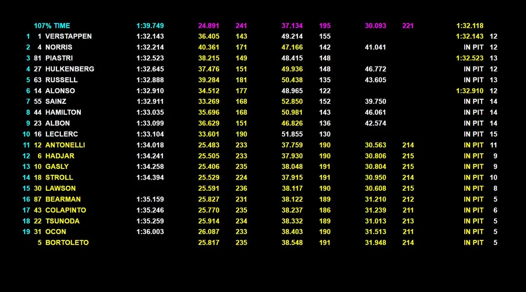 Nel finale, Piastri e Verstappen hanno deciso di uscire per ultimi: Piastri si è assicurato la seconda posizione, mentre Verstappen ha firmato una pole strepitosa, confermando il suo dominio e chiudendo la sessione con un giro praticamente perfetto.
